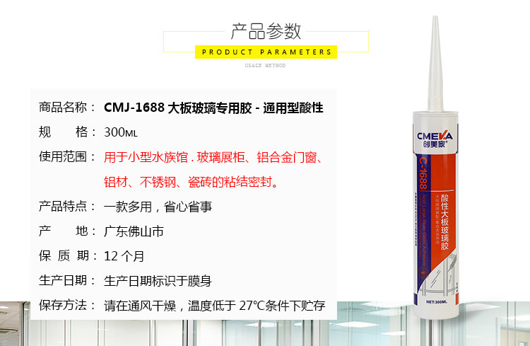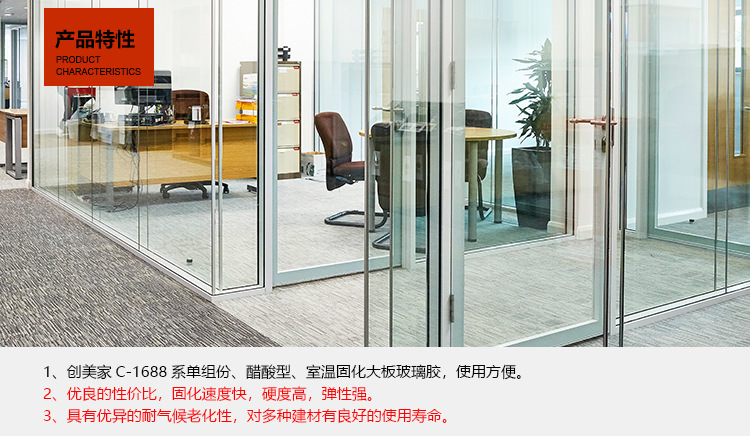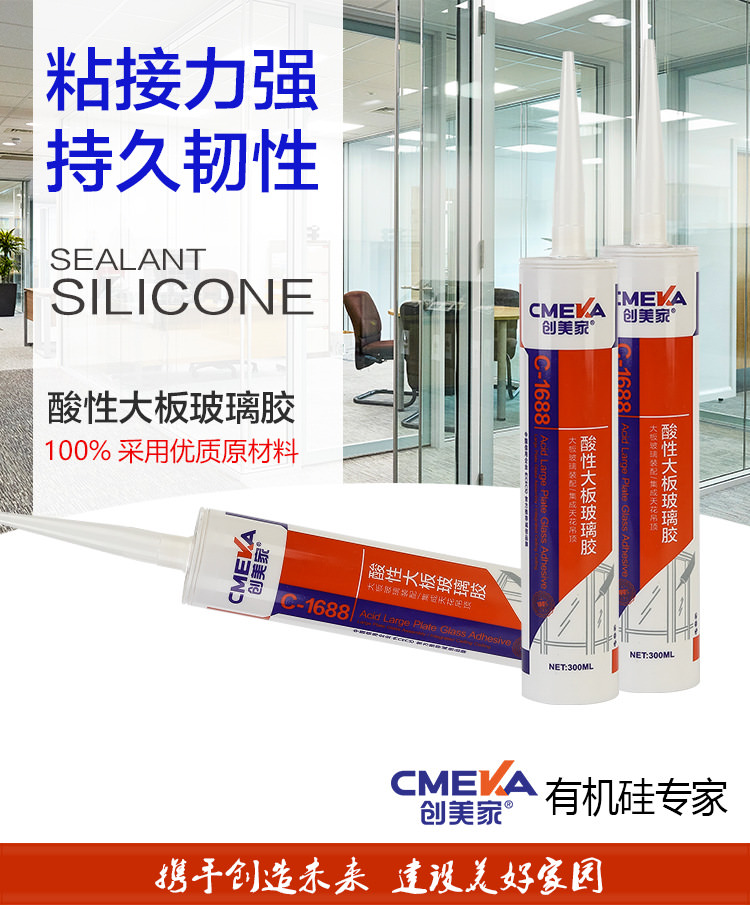 1、創美家C-1688系單組份、醋酸型、室溫固化硅酮玻璃膠,使用方便。