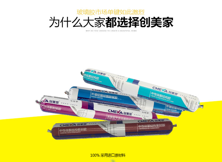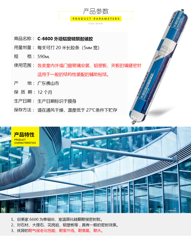 1、創(chuàng)美家C-6600為單組份、室溫固化硅酮結構密封膠。